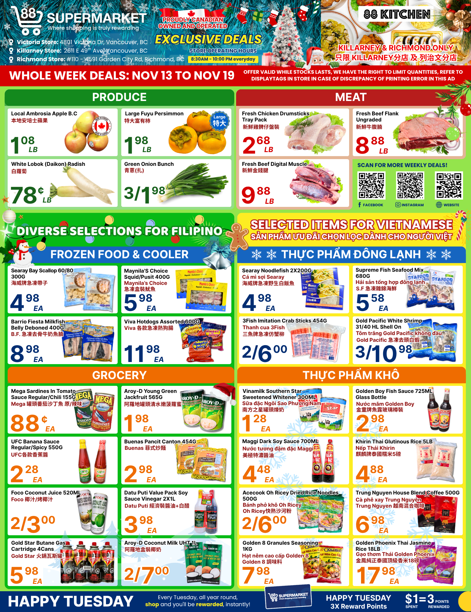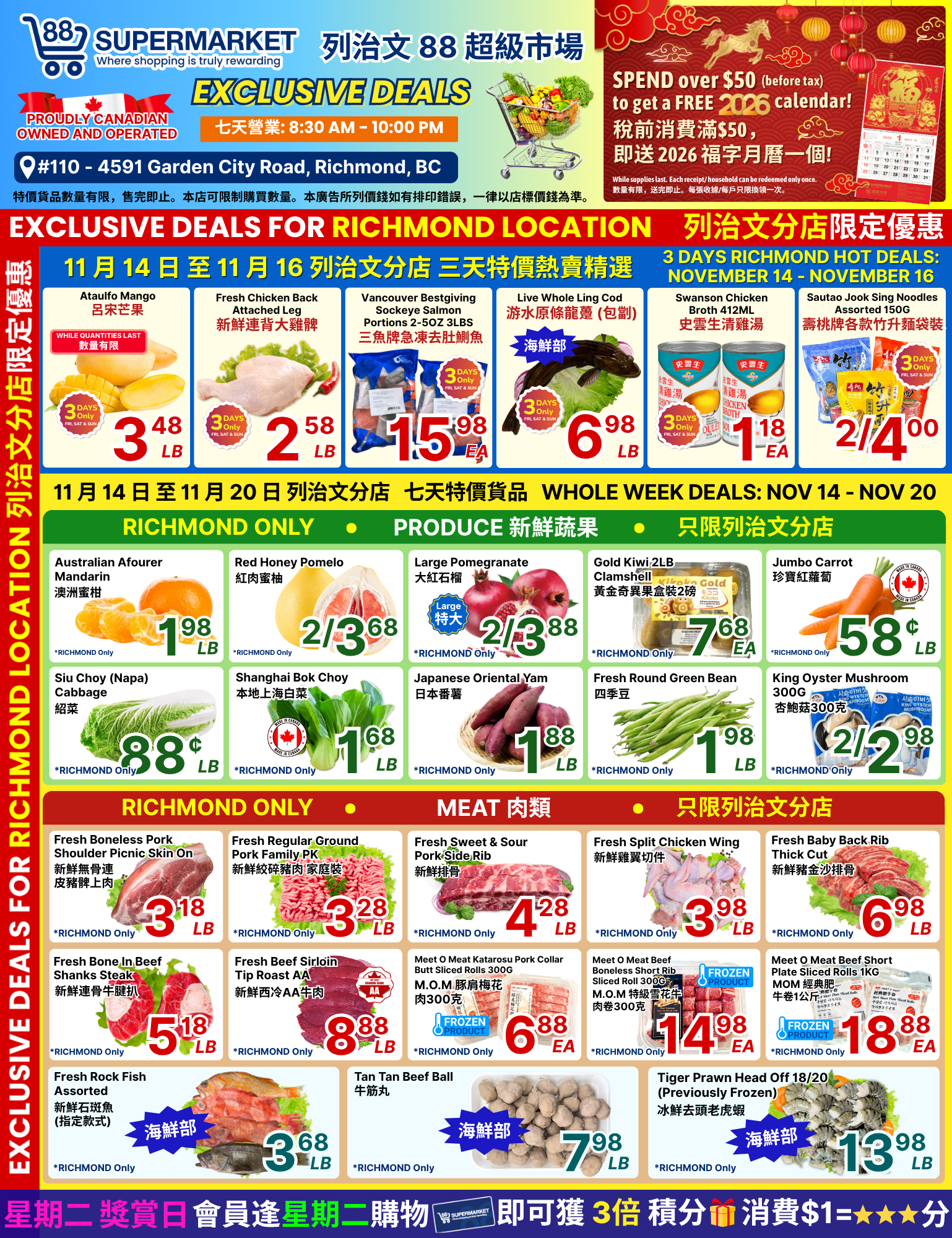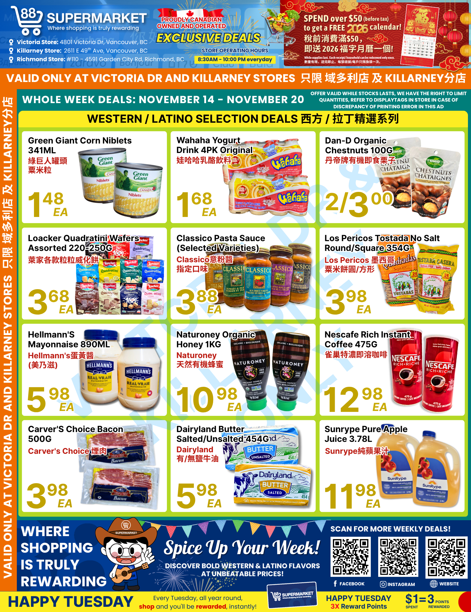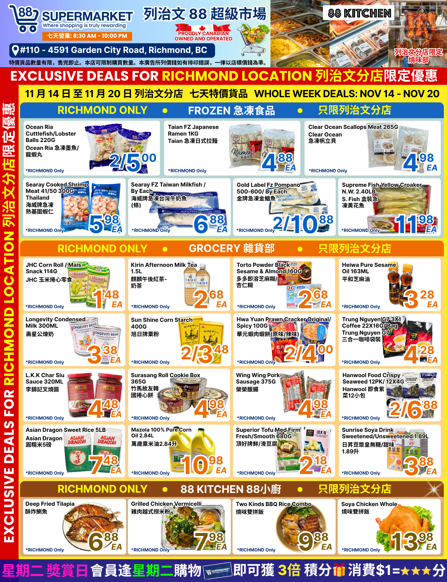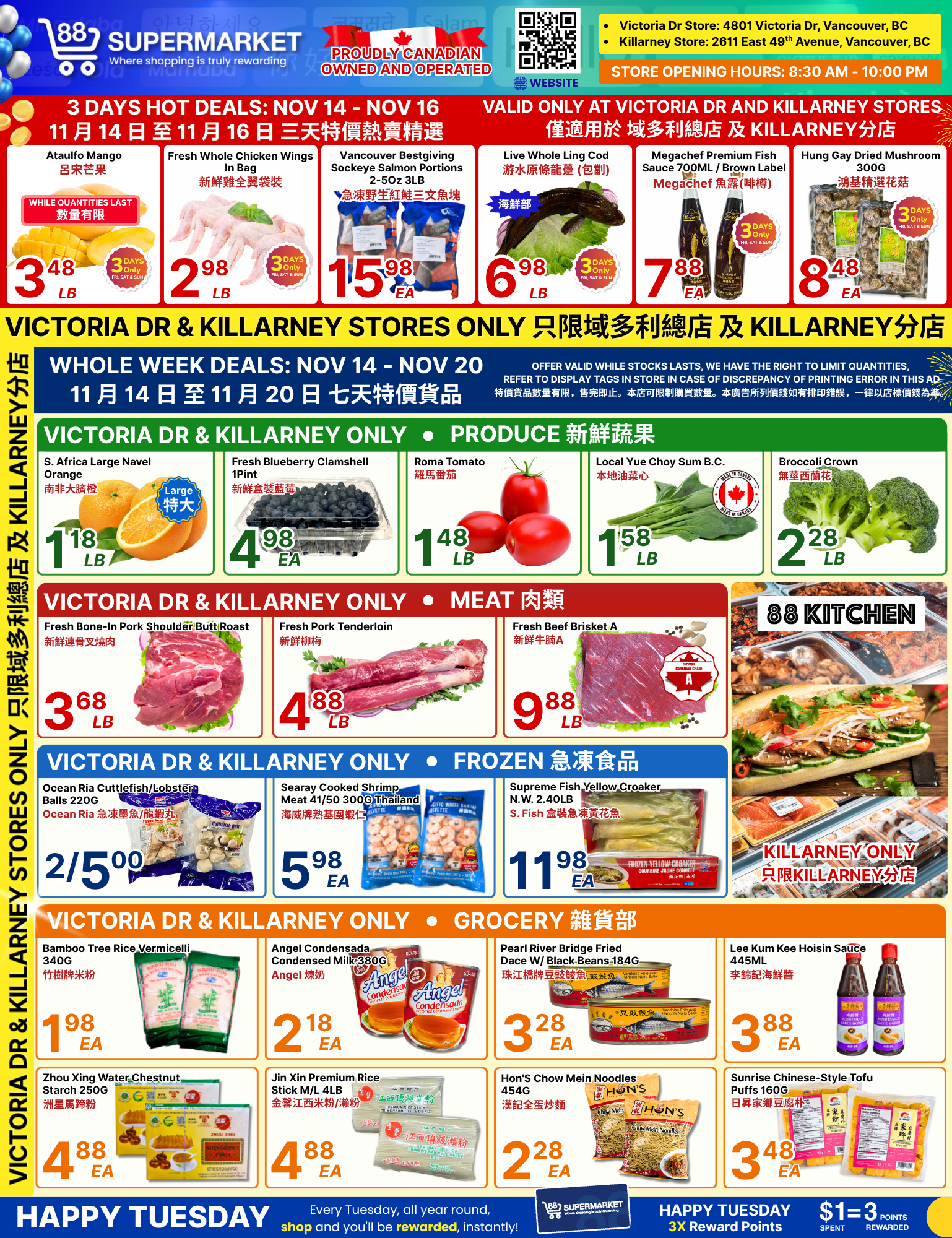 88超市(88 Supermarket) 本周特价11月14日-11月20日2025 88 Supermarket成立于2006年,是大温哥华地区种类最多的世界食品之一。以非常实惠的价格提供来自世界各地的食品品种以及多种北美本地食品。 在这里,您可以每天以更低的价格找到新鲜的肉类,新鲜的乳制品,面包店和活海鲜,多种亚洲和西式食品,种类繁多的农产品部门,异国水果和难以找到的蔬菜。 (点击图片可放大查看)